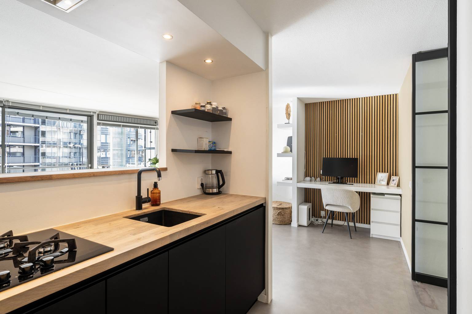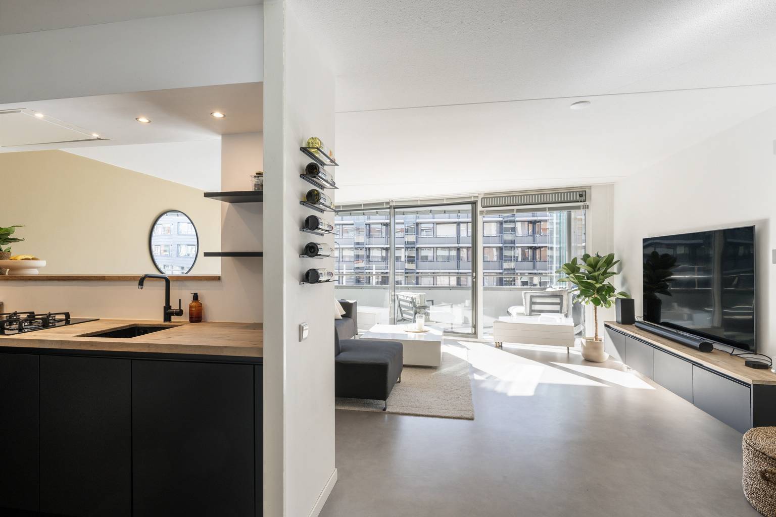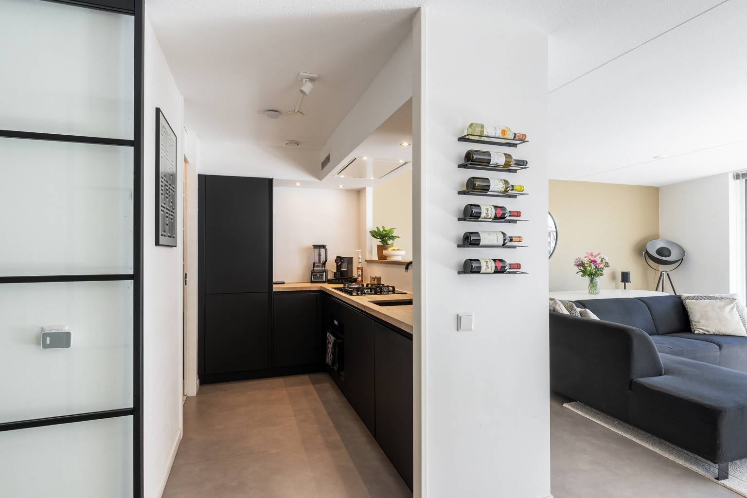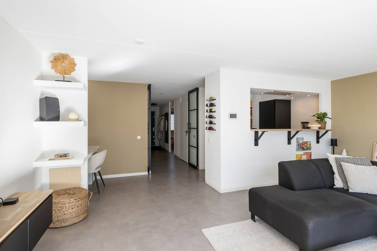 De lichte woonkamer is gesitueerd aan de voorzijde en heeft een grote glazen schuifpui richting het balkon. In de woonkamer is een aparte werkplek gecreëerd, met een bureaublad en een achterwand van houten panelen. Er is een doorkijk naar de halfopen keuken, die is opgesteld in een L-vorm. De keuken is uitgevoerd in een donkere kleur met een houten aanrechtblad en is voorzien van diverse apparatuur, waaronder een koel-/vriescombinatie, een combi oven/magnetron, een vaatwasser, een gaskookplaat en een in de koof geïntegreerde afzuigkap. De koof is tevens voorzien van inbouw spots en vanuit de keuken is er toegang tot de inpandige berging met de opstelling van de Cv-ketel en de wasmachineaansluiting.