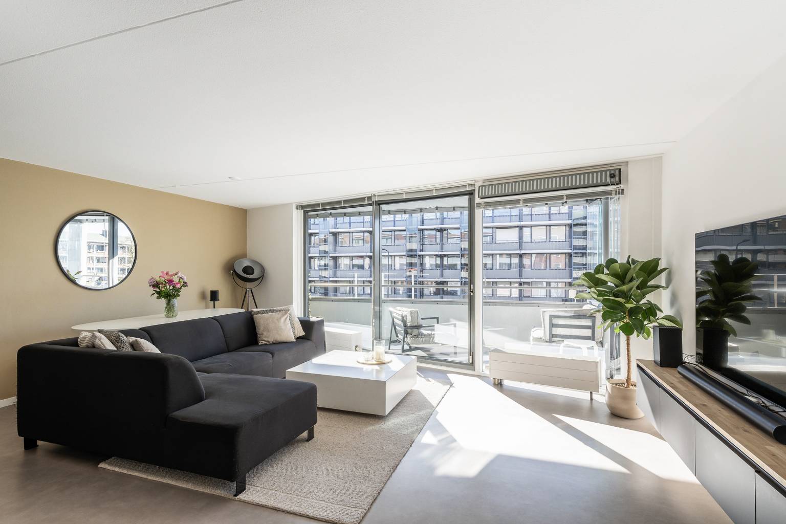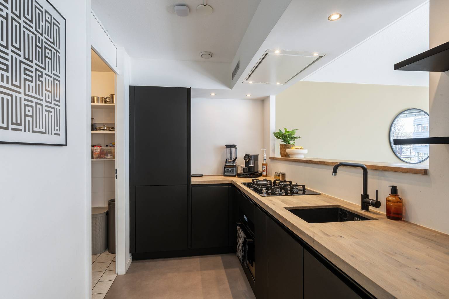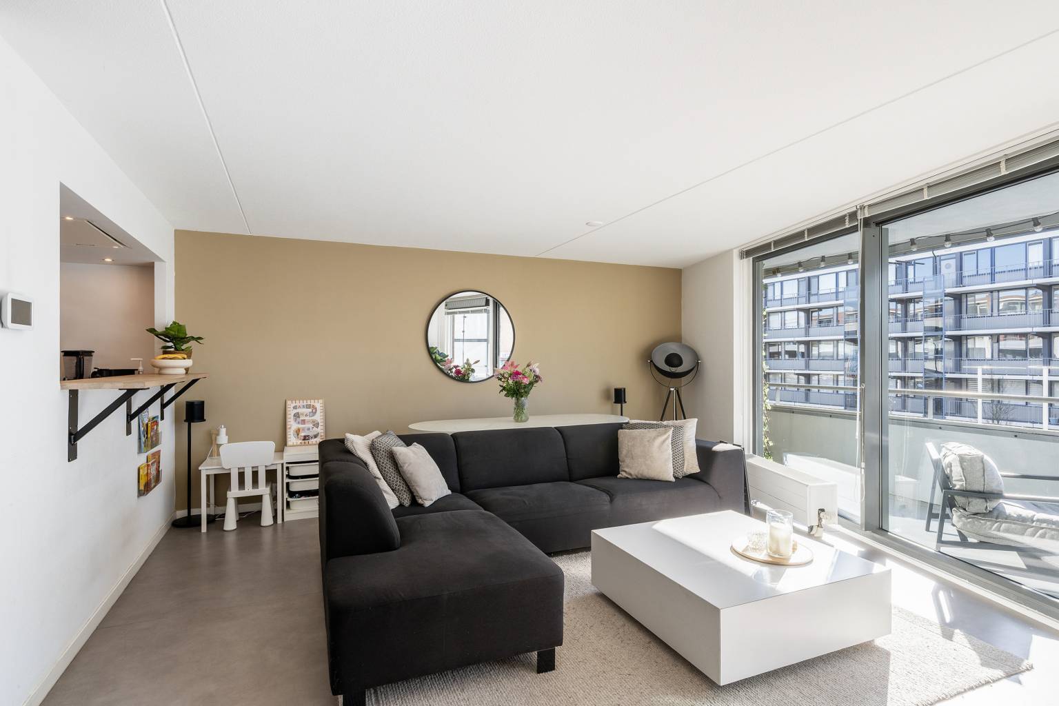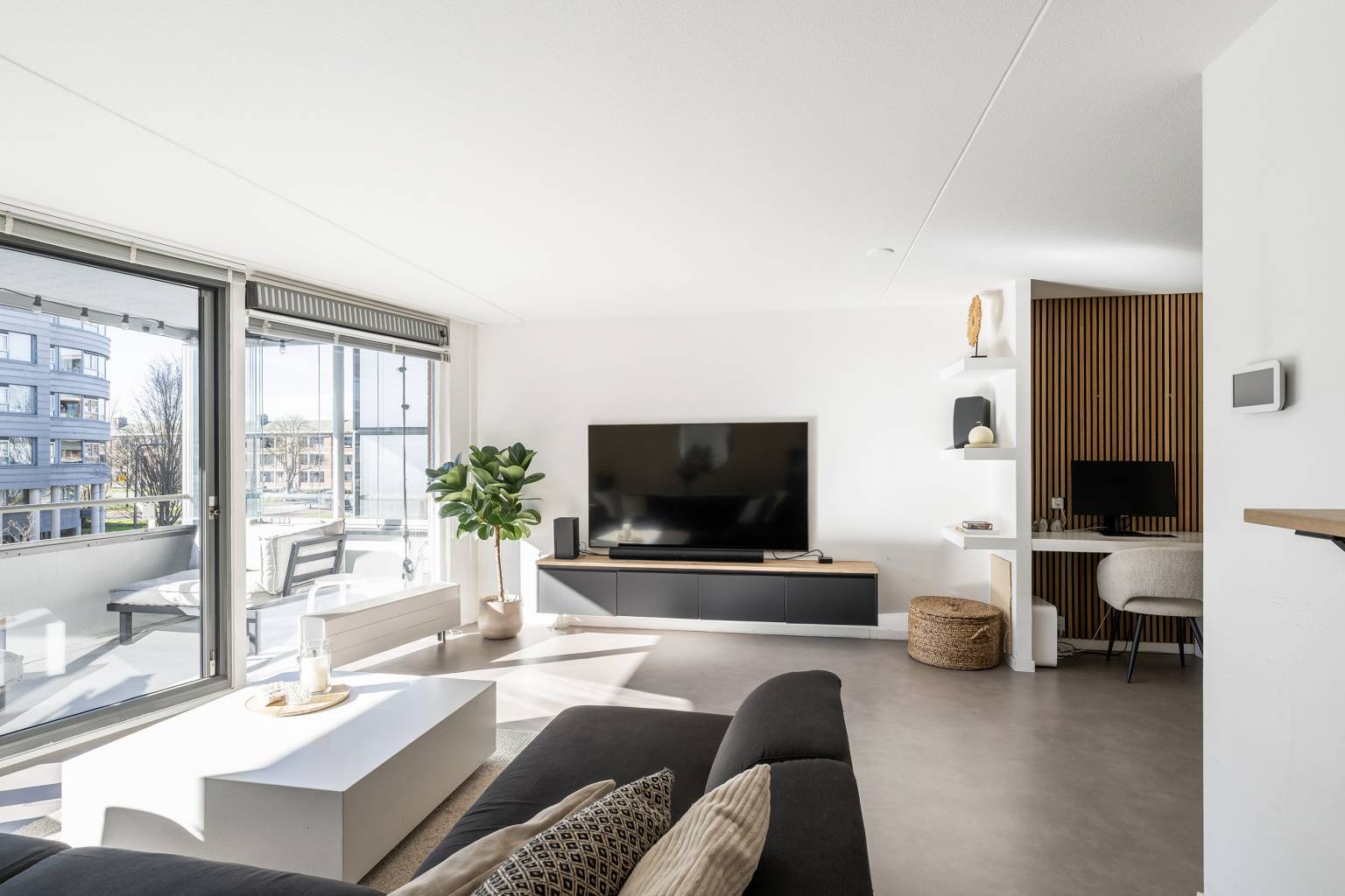 De lichte woonkamer is gesitueerd aan de voorzijde en heeft een grote glazen schuifpui richting het balkon. In de woonkamer is een aparte werkplek gecreëerd, met een bureaublad en een achterwand van houten panelen. Er is een doorkijk naar de halfopen keuken, die is opgesteld in een L-vorm. De keuken is uitgevoerd in een donkere kleur met een houten aanrechtblad en is voorzien van diverse apparatuur, waaronder een koel-/vriescombinatie, een combi oven/magnetron, een vaatwasser, een gaskookplaat en een in de koof geïntegreerde afzuigkap. De koof is tevens voorzien van inbouw spots en vanuit de keuken is er toegang tot de inpandige berging met de opstelling van de Cv-ketel en de wasmachineaansluiting.