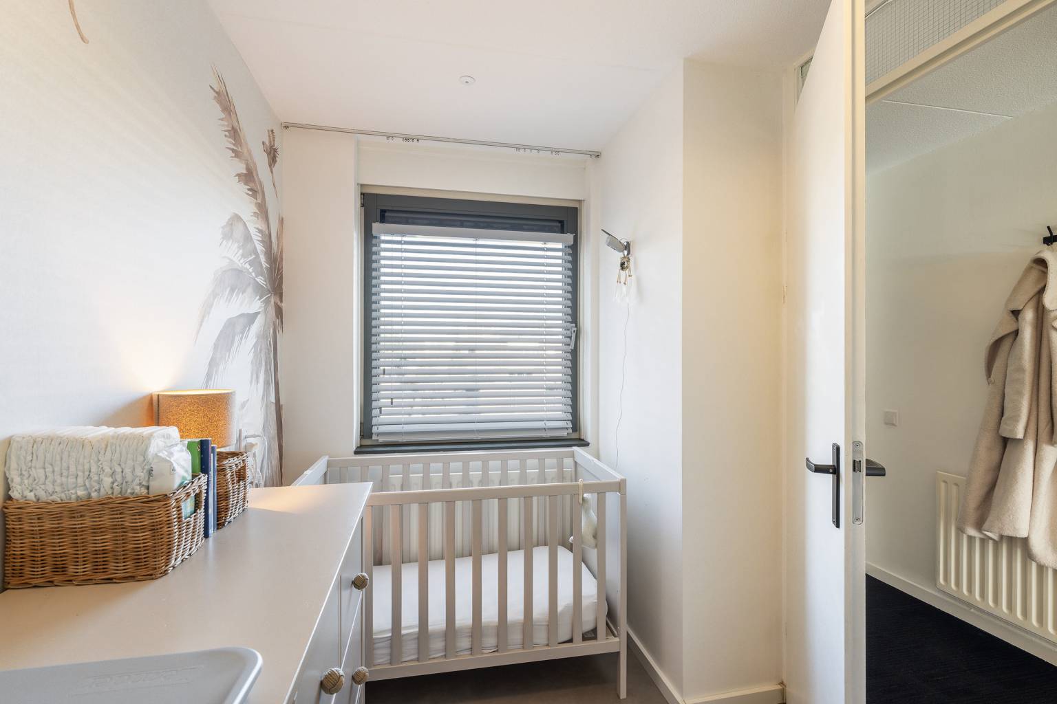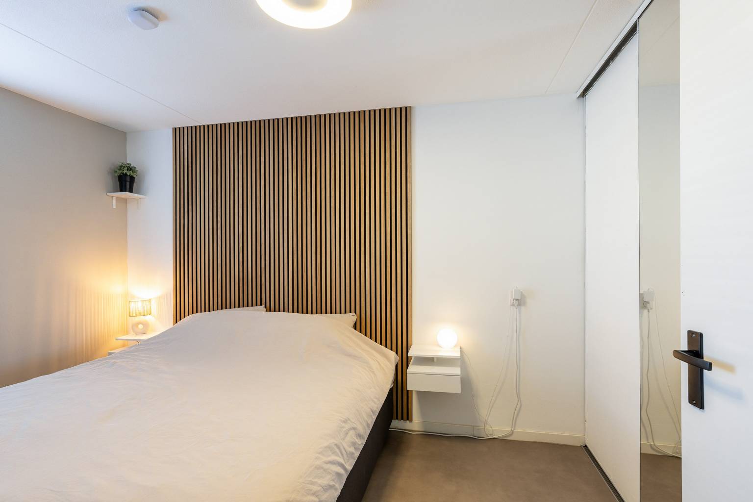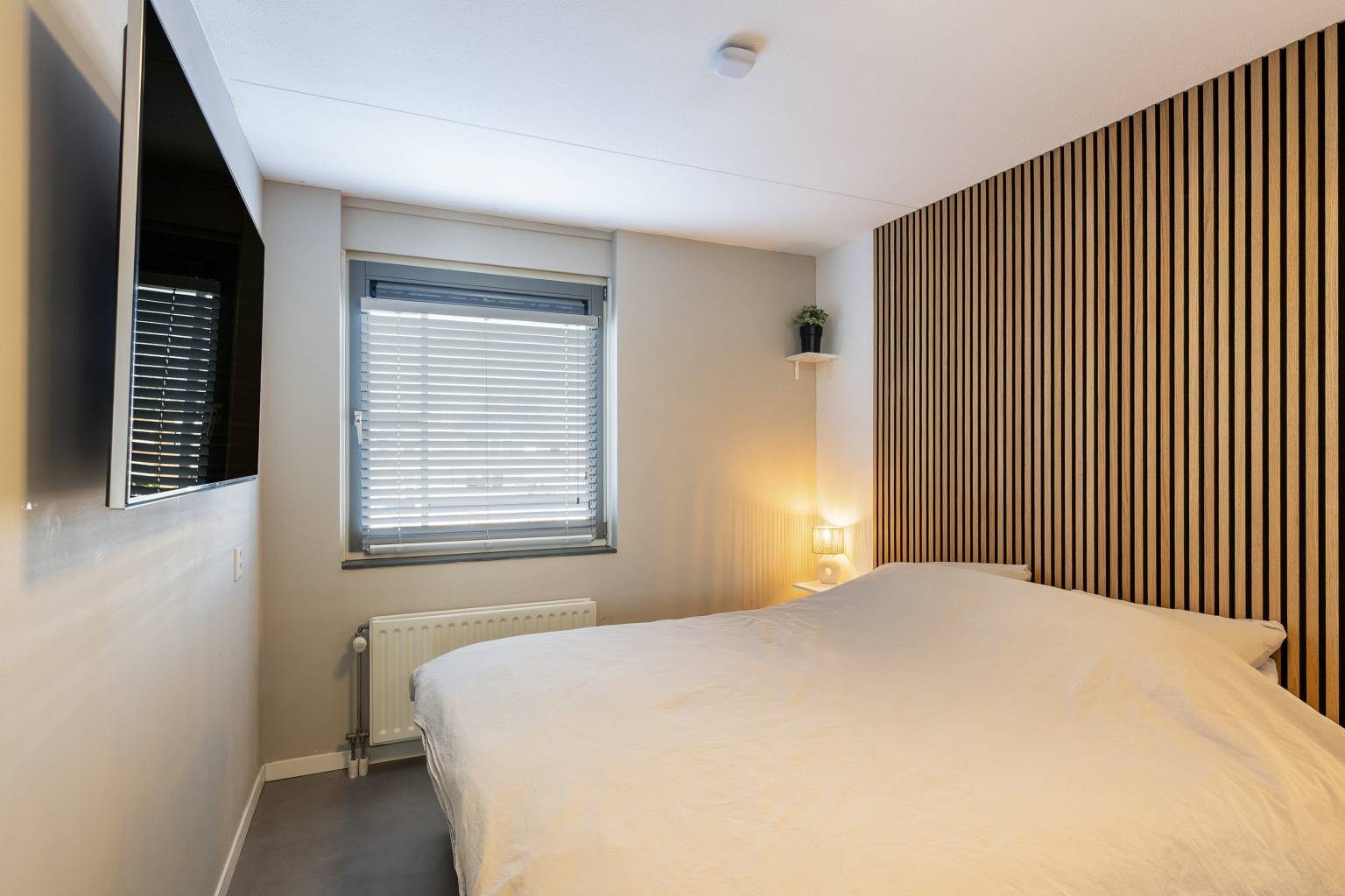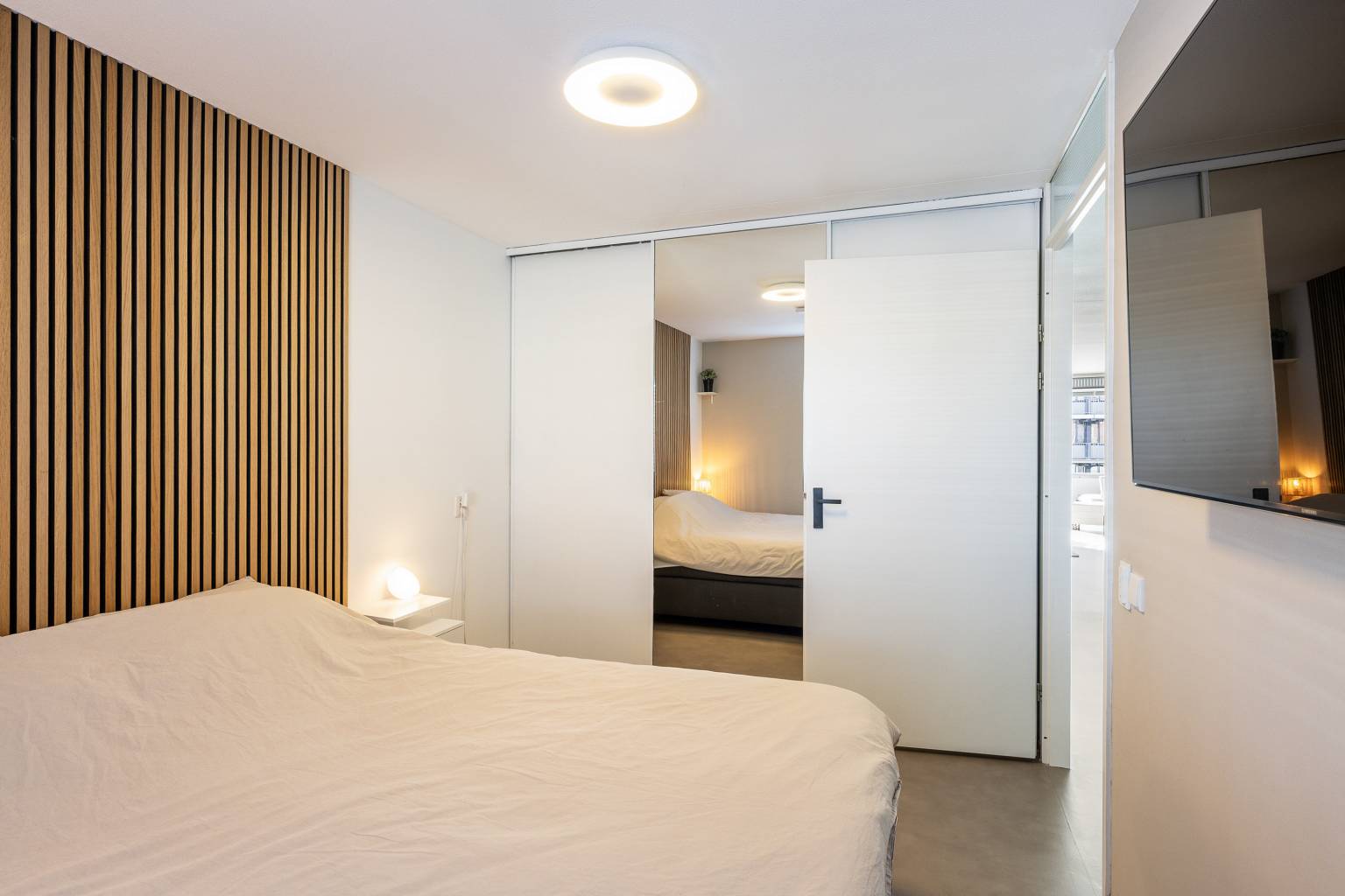 De twee slaapkamers bevinden zich beide aan de galerijzijde, waarbij de hoofdslaapkamer beschikt over een vaste kast met schuifdeuren en een gedeeltelijk met houten panelen afgewerkte wand. Beide kamers beschikken over elektrische rolluiken, die met een afstandsbediening zijn te bedienen.