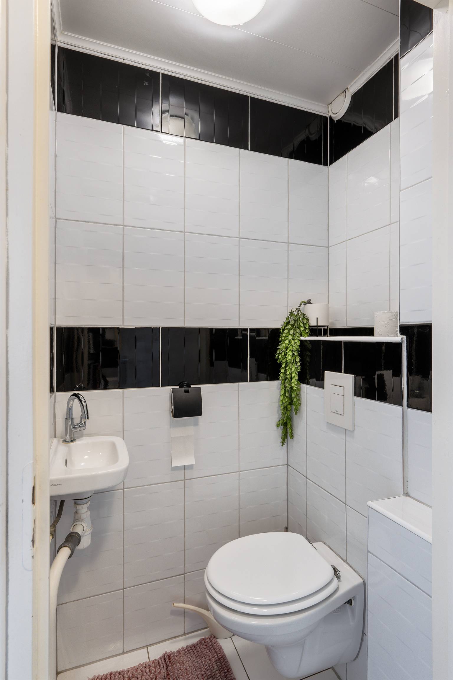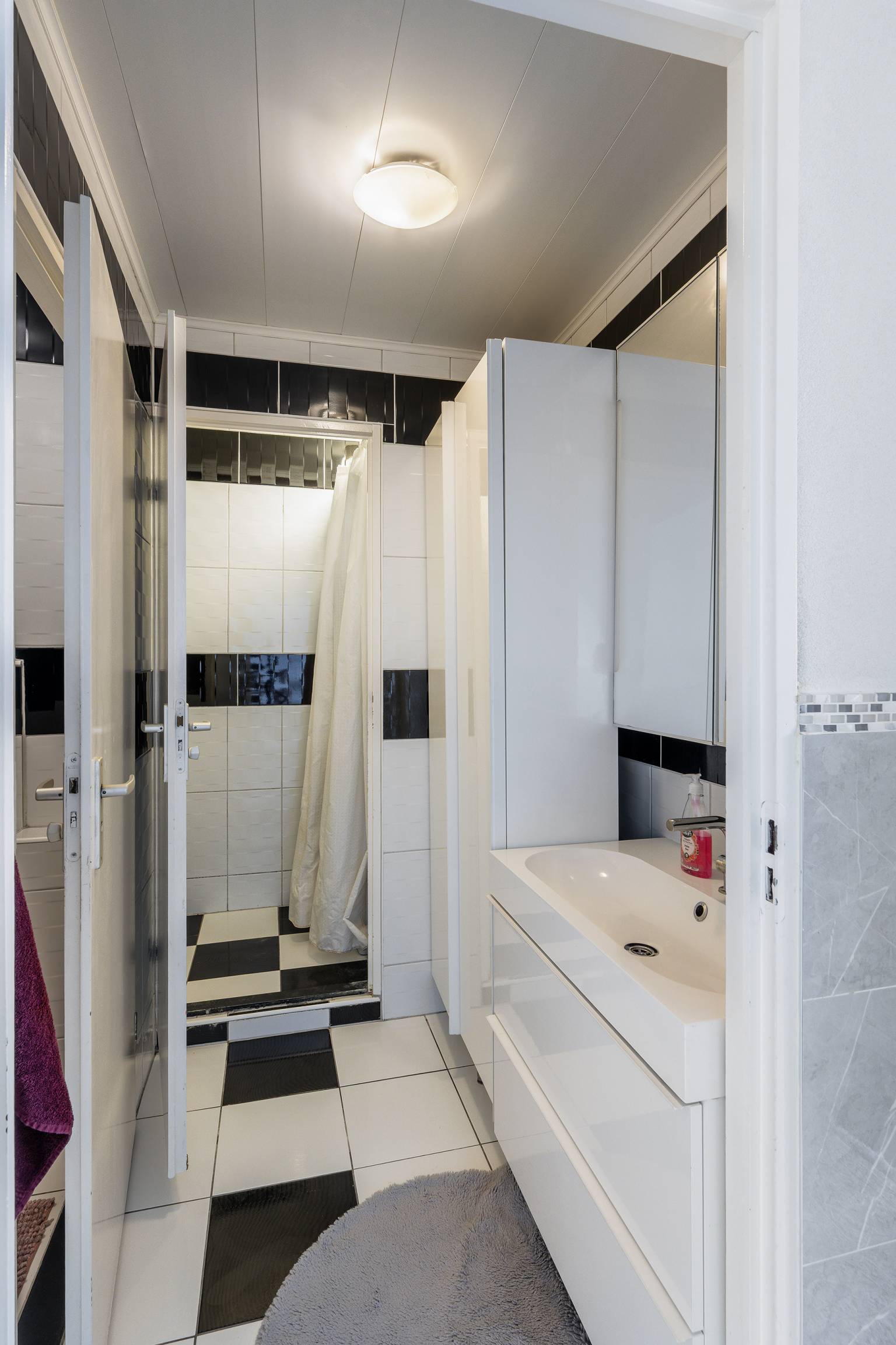 De volledig betegelde badkamer is opgedeeld in drie ruimtes. Het voorportaal is voorzien van een wastafelmeubel met hoge kasten en een spiegelkast, daarna is er een afsluitbare ruimte met de douche en de wasmachine aansluiting en het toilet is praktisch separaat en extra voorzien van een fonteintje.