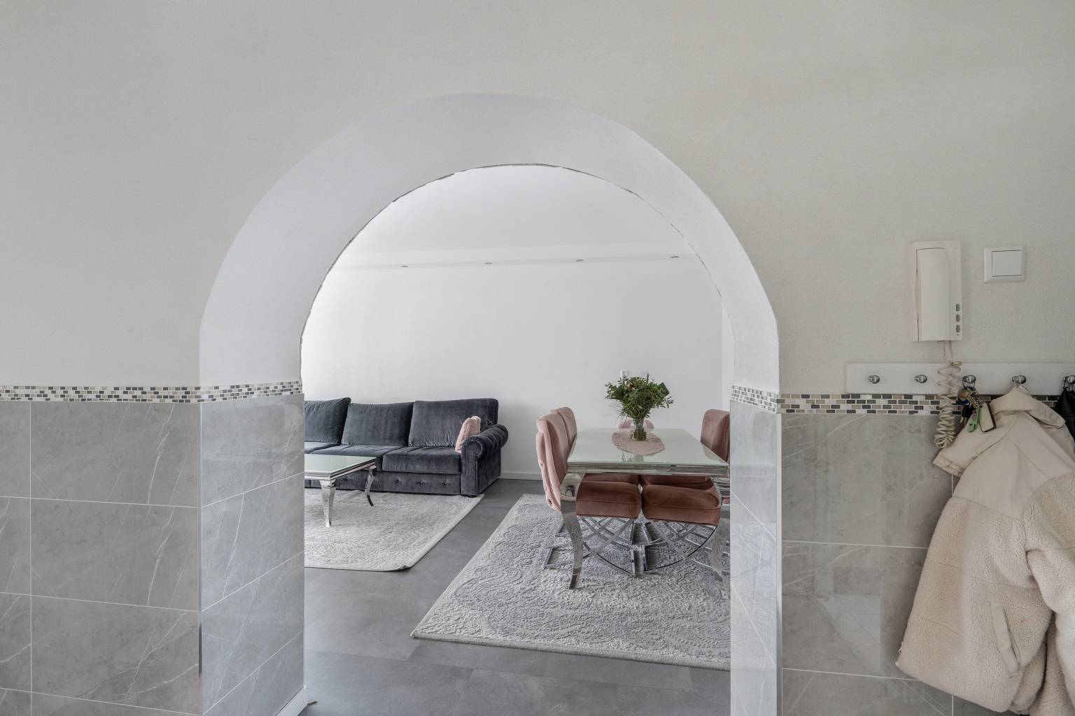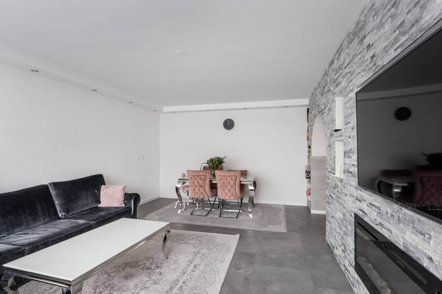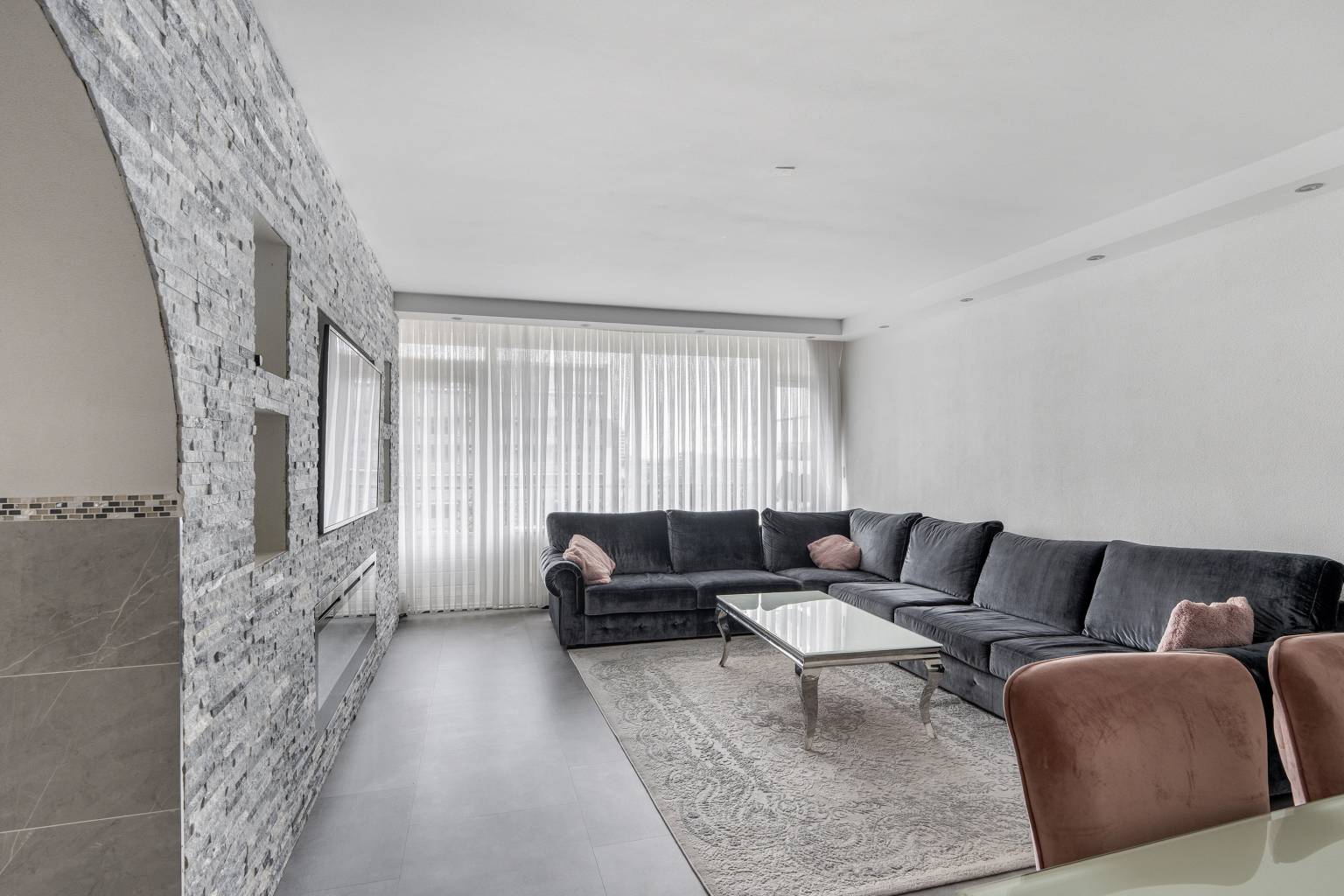 De woonkamer is een open ruimte met plaats voor zowel een zit- als een eethoek. De cinewall is voorzien van een elektrische haard en er zijn diverse nissen aanwezig. Langs het plafond is een koof geplaatst met inbouw spots en er is een deur naar het balkon.