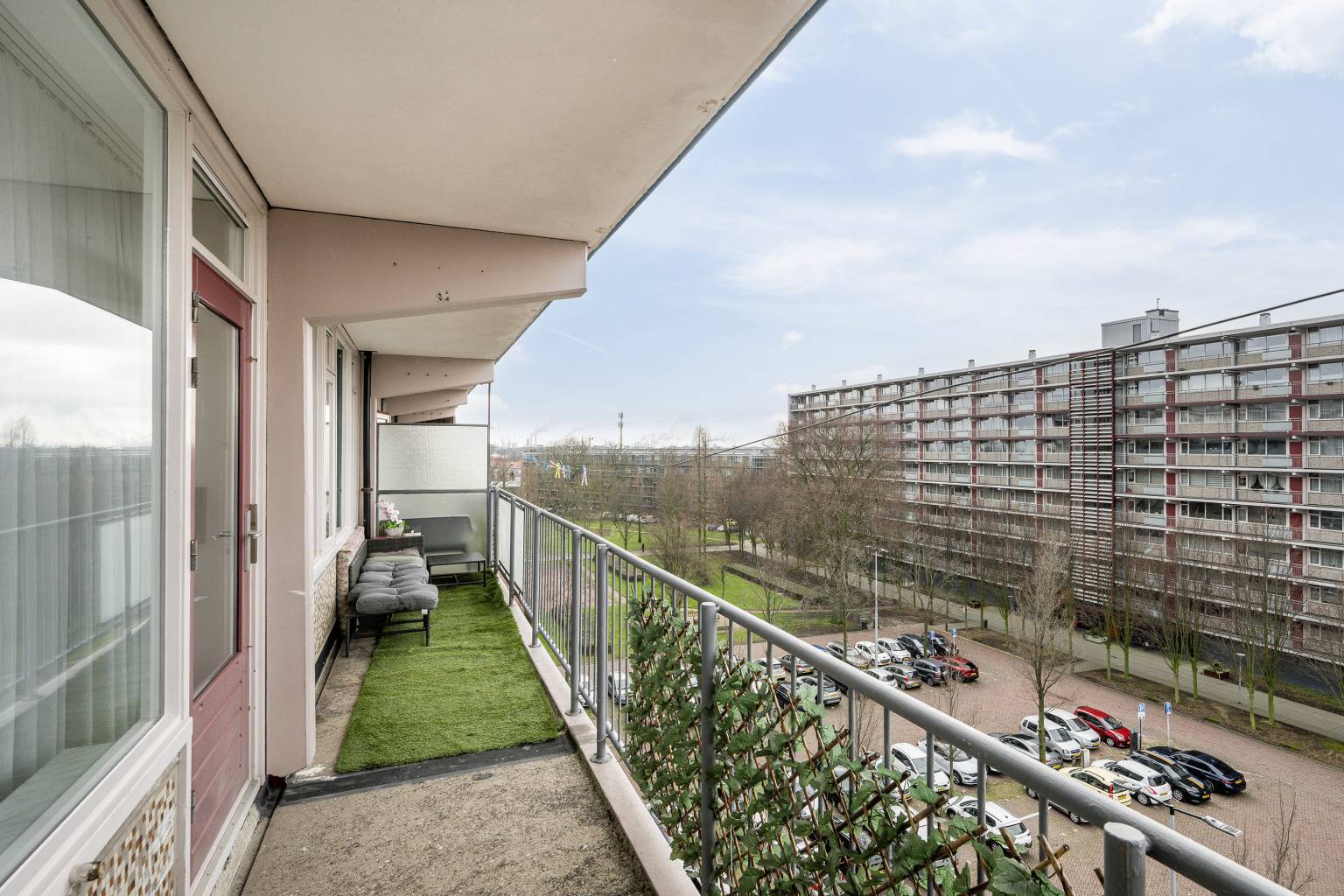 Het balkon is fijn overdekt en heeft een metalen hekwerk. De glazen panelen zorgen voor een scheiding naar de aangrenzende balkons en vanaf hier is er een vrij uitzicht over de wijk en de voorbij varende schepen.