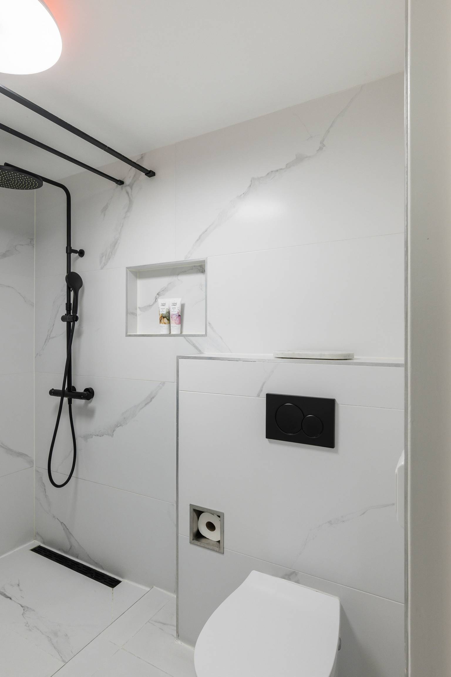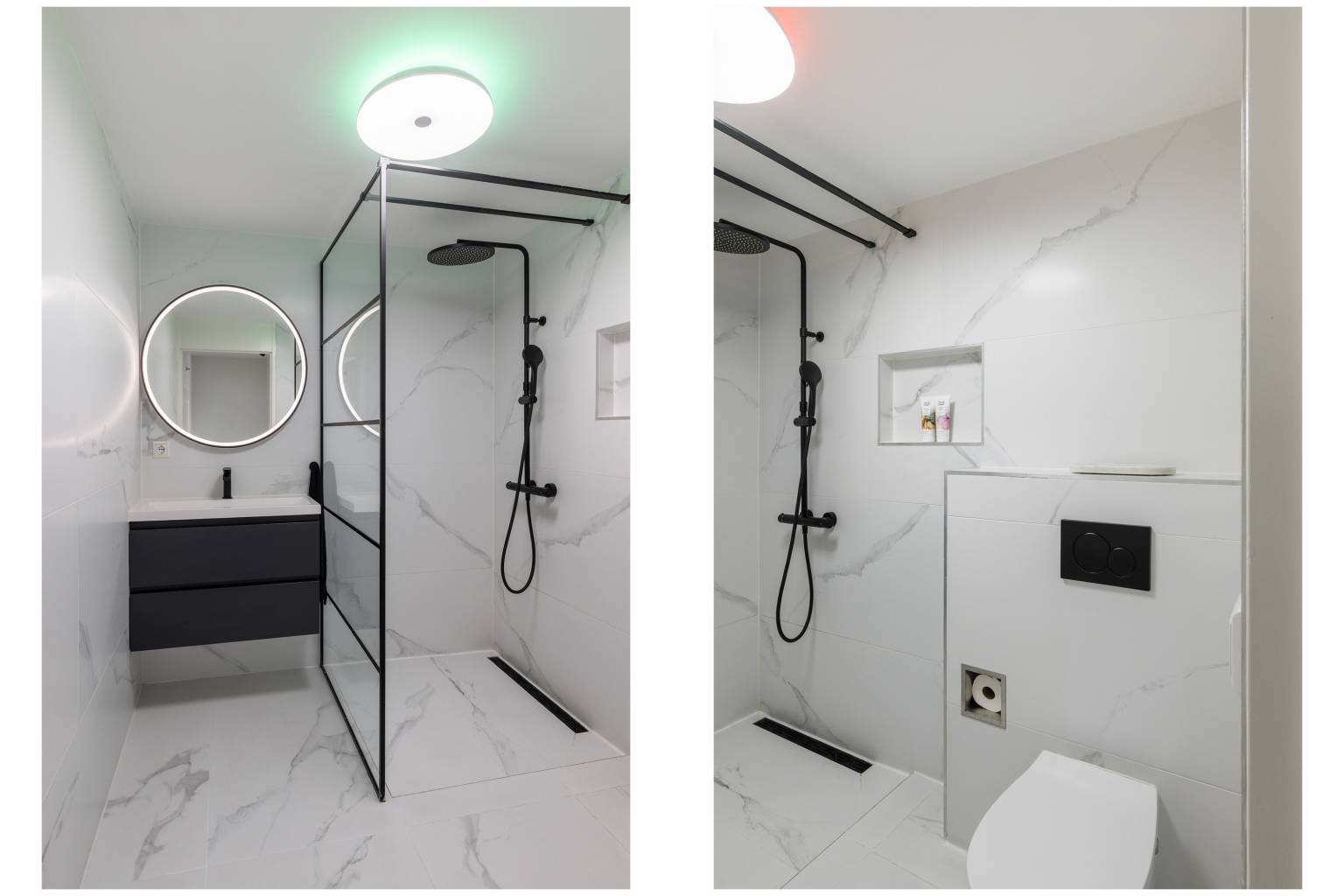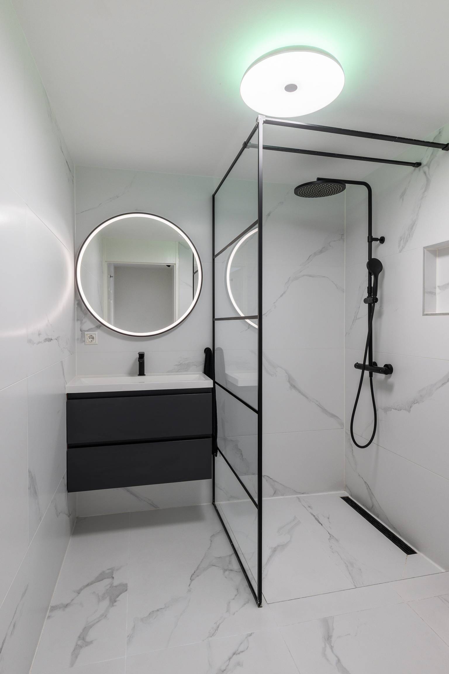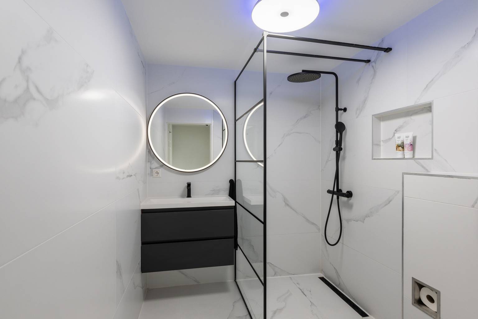 De inpandige badkamer, met vloerverwarming, is volledig betegeld en uitgerust met een inloopdouche, een toilet en een wastafelmeubel met daarboven een spiegel met verlichting.