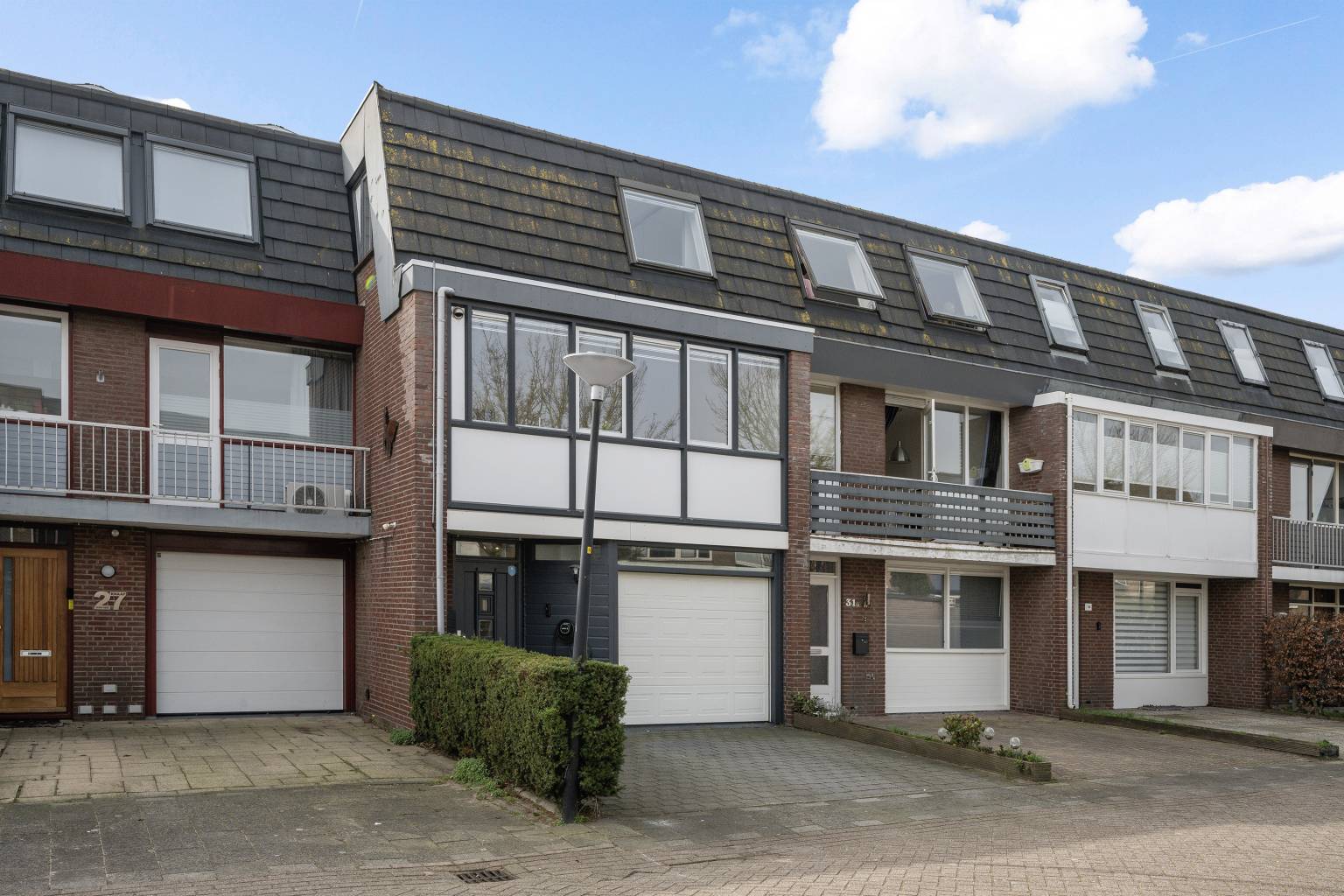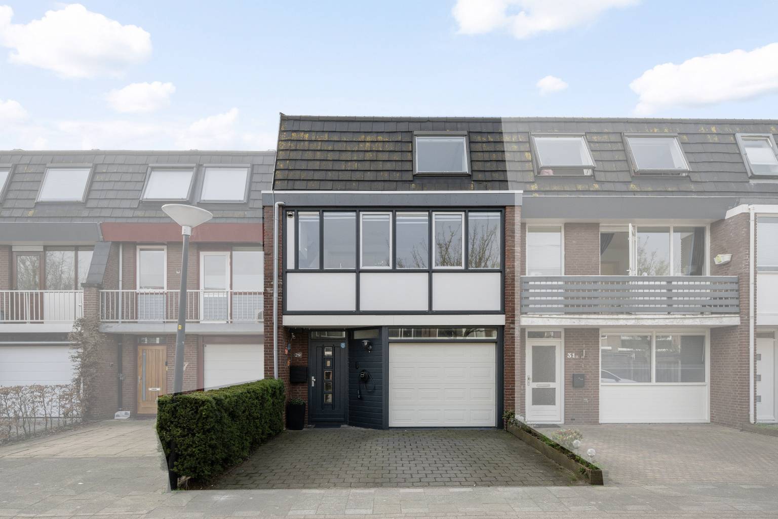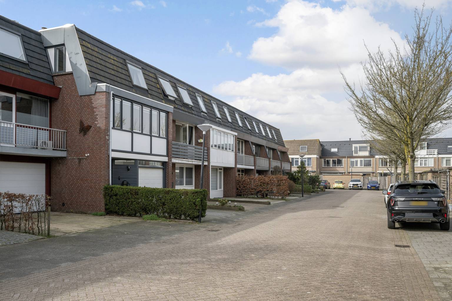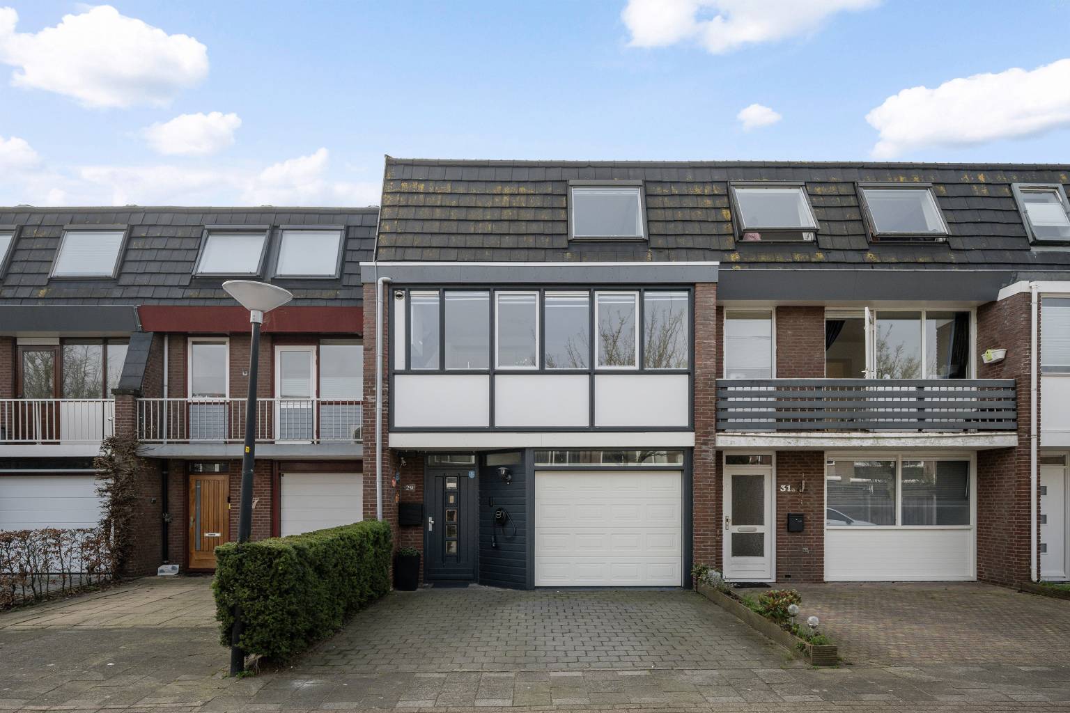 Vanaf de straat is er een open toegang tot de bestraatte oprit, die toegang geeft tot de garage en plaatst biedt voor het parkeren van twee auto’s op eigen terrein. Aan de gevel, naast de voordeur, hangt een oplaadpunt voor een elektrische auto en er hangt een buitenlamp.