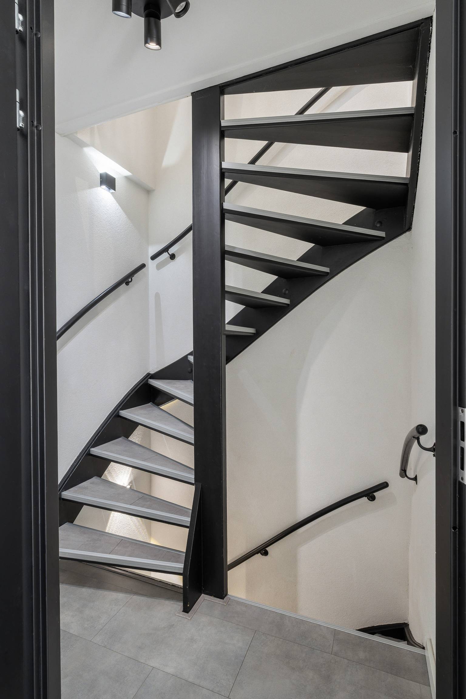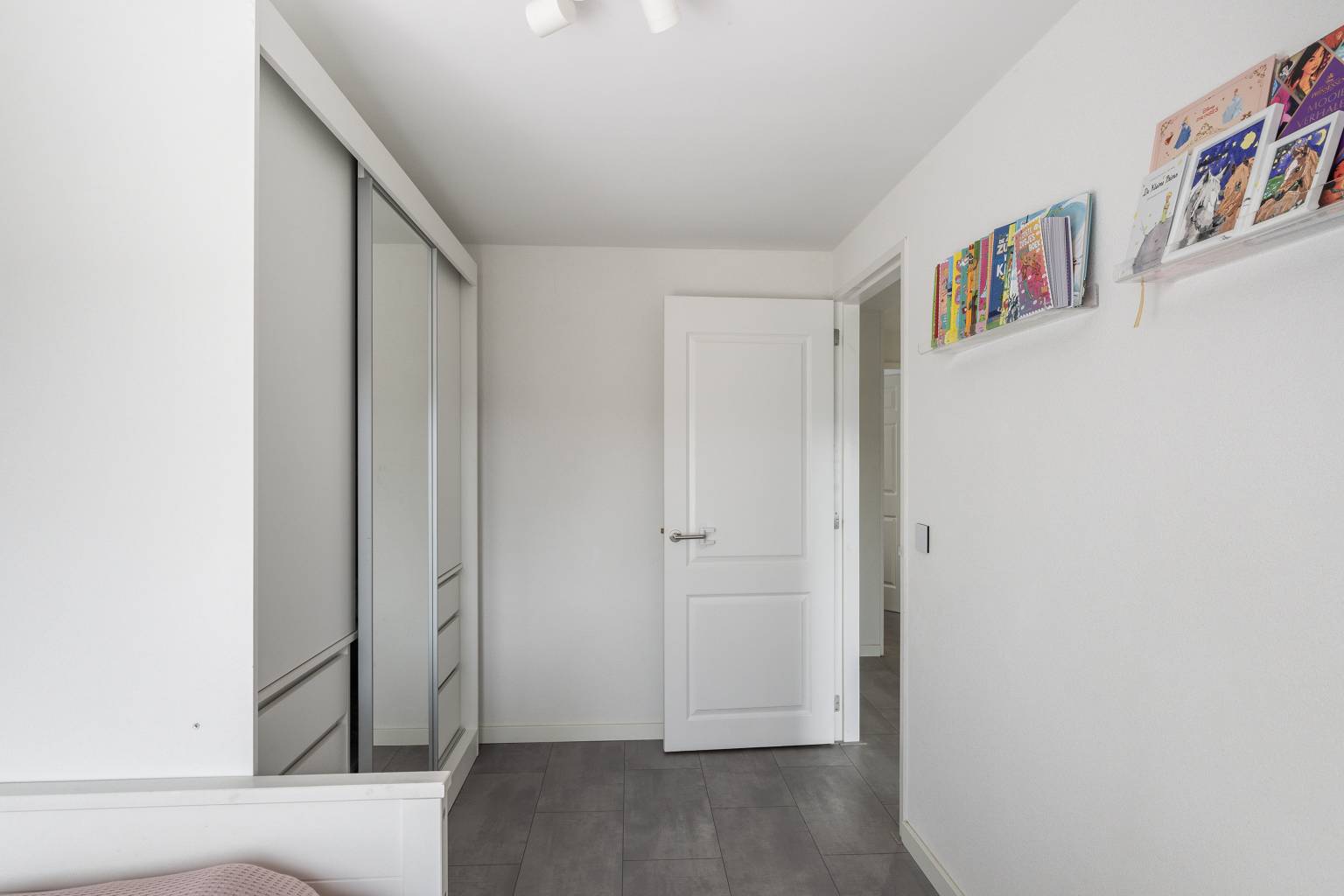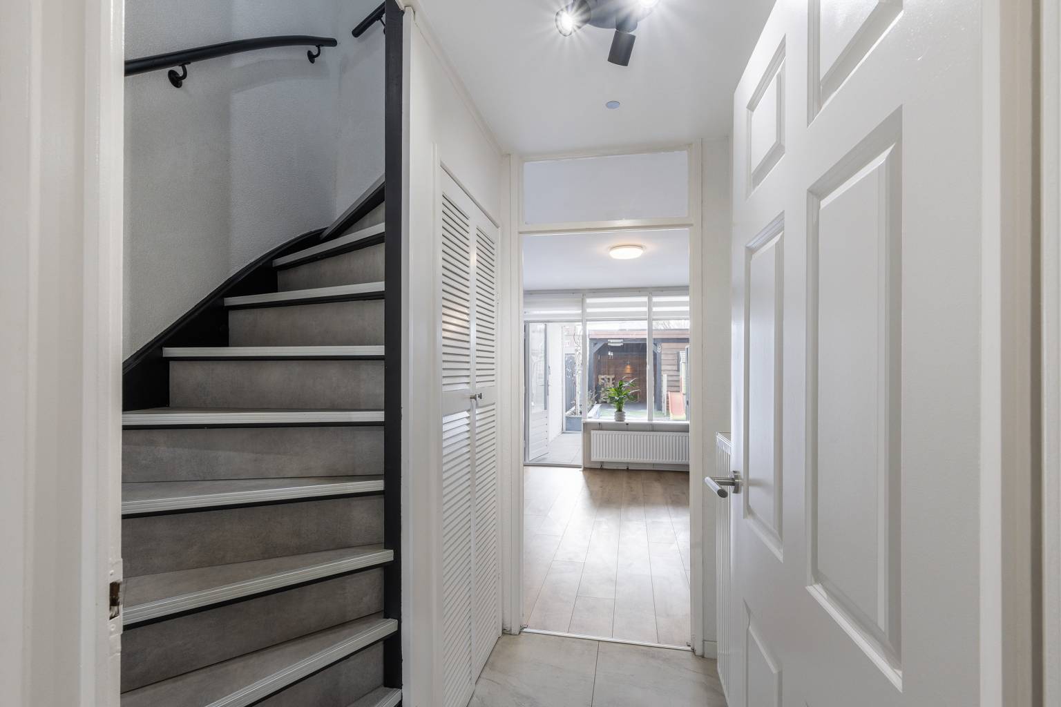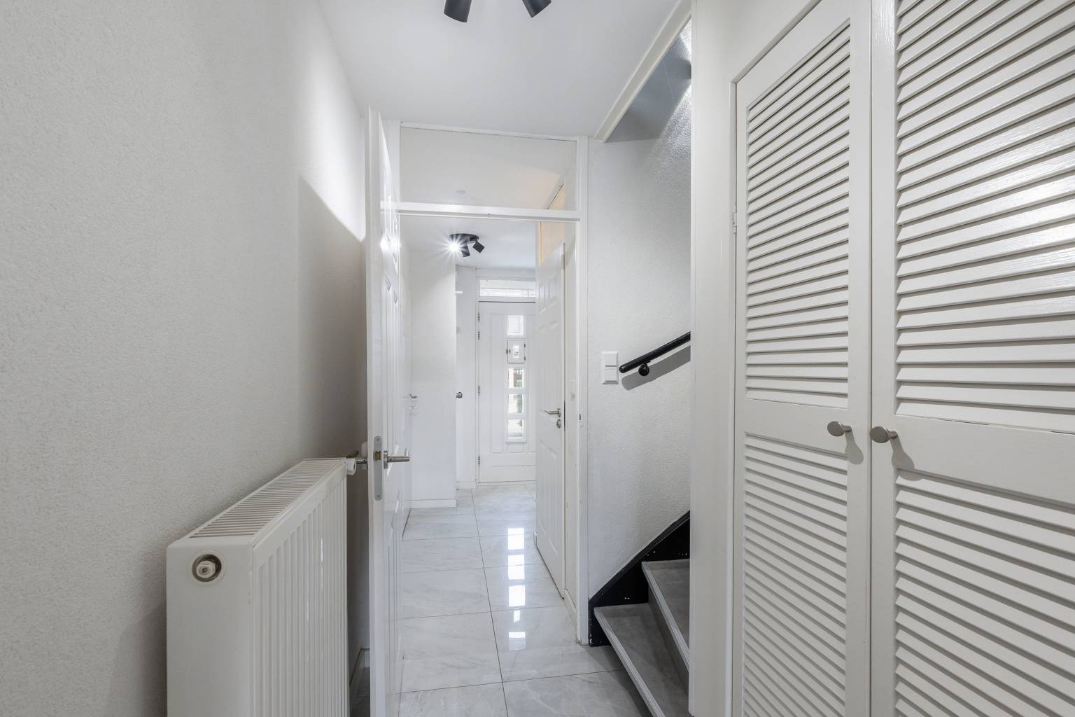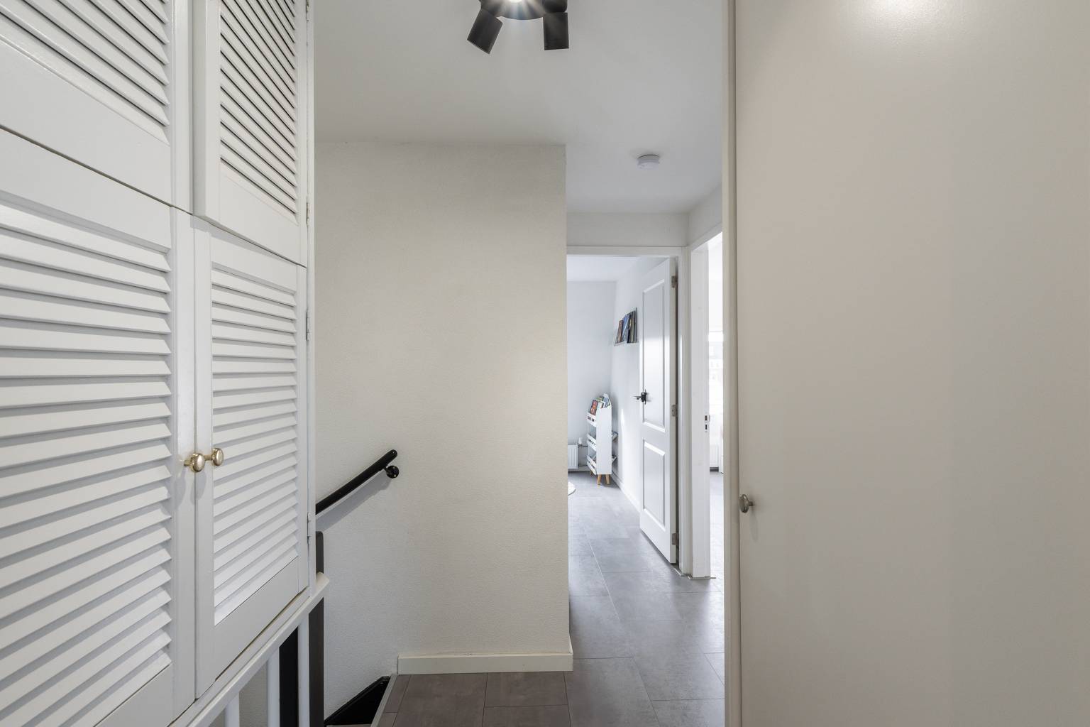 De tweede hal geeft toegang tot een slaapkamer en de trap naar de 1e verdieping, met daaronder een vaste kast met louvredeurtjes.
