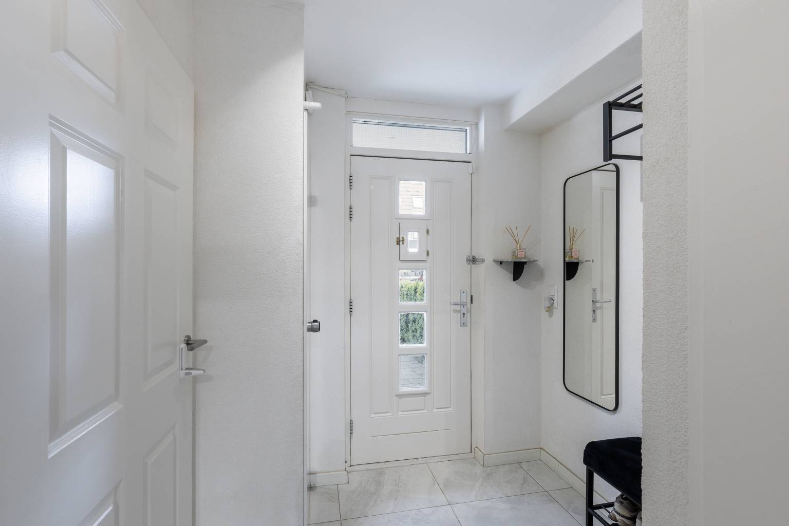 Na de voordeur is er een binnenkomst in de afsluitbare entreehal, die is voorzien van de meterkast. Vanuit deze entreehal is er toegang tot de garage, het volledig betegelde toilet en een aangrenzende tweede hal. Op de vloer liggen marmerlook tegels en de wanden zijn afgewerkt met spachtelputz.