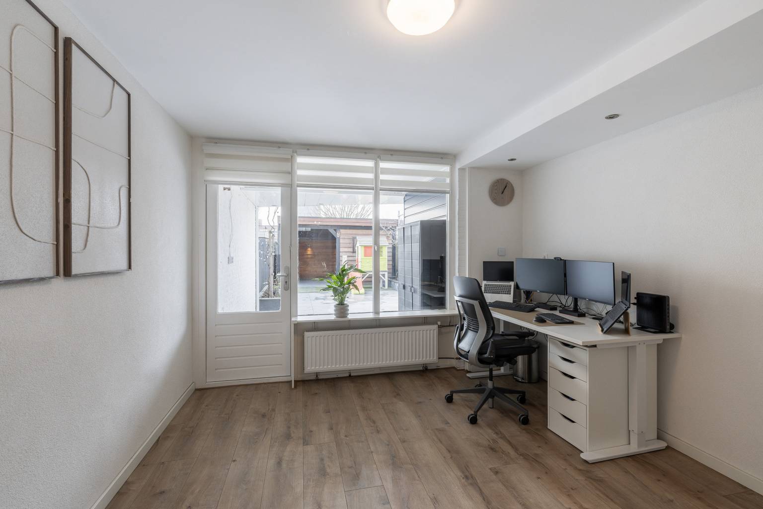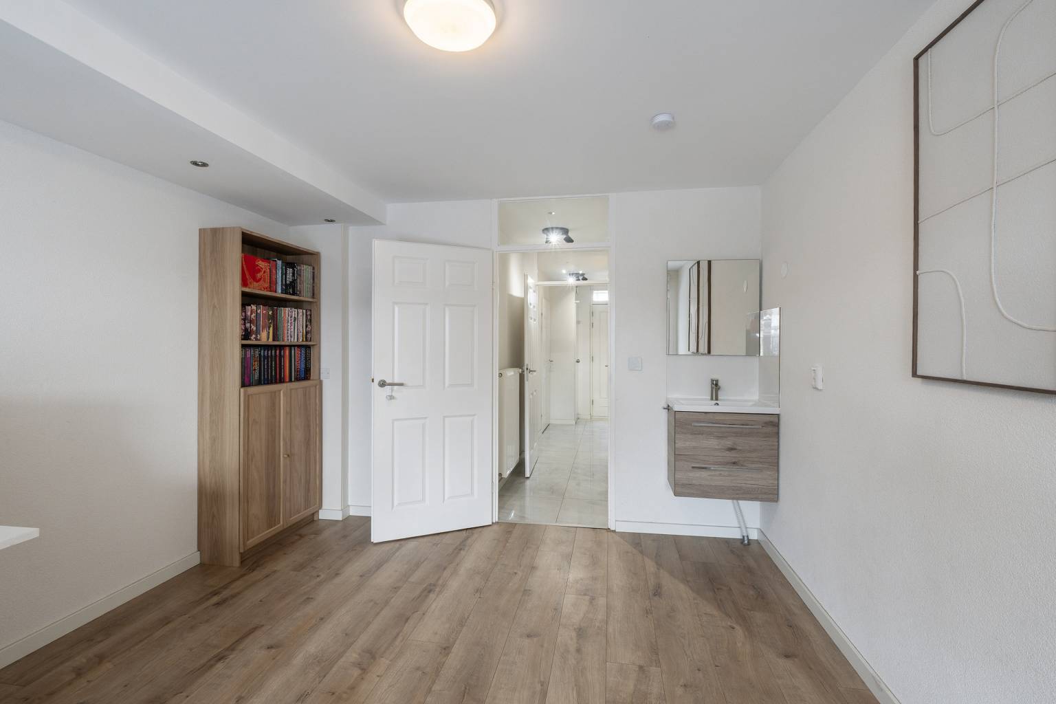 De slaapkamer is gesitueerd aan de achterzijde en beschikt over een eigen toegang tot de achtertuin. Deze ruimte is ook uitermate geschikt voor kantoor aan huis of als werk-/hobbyruimte. Op de vloer ligt parket en de wanden zijn afgewerkt met spachtelputz. Langs het plafond is een koof geplaatst met inbouw spots en daarnaast hangt er een wastafelmeubel.
