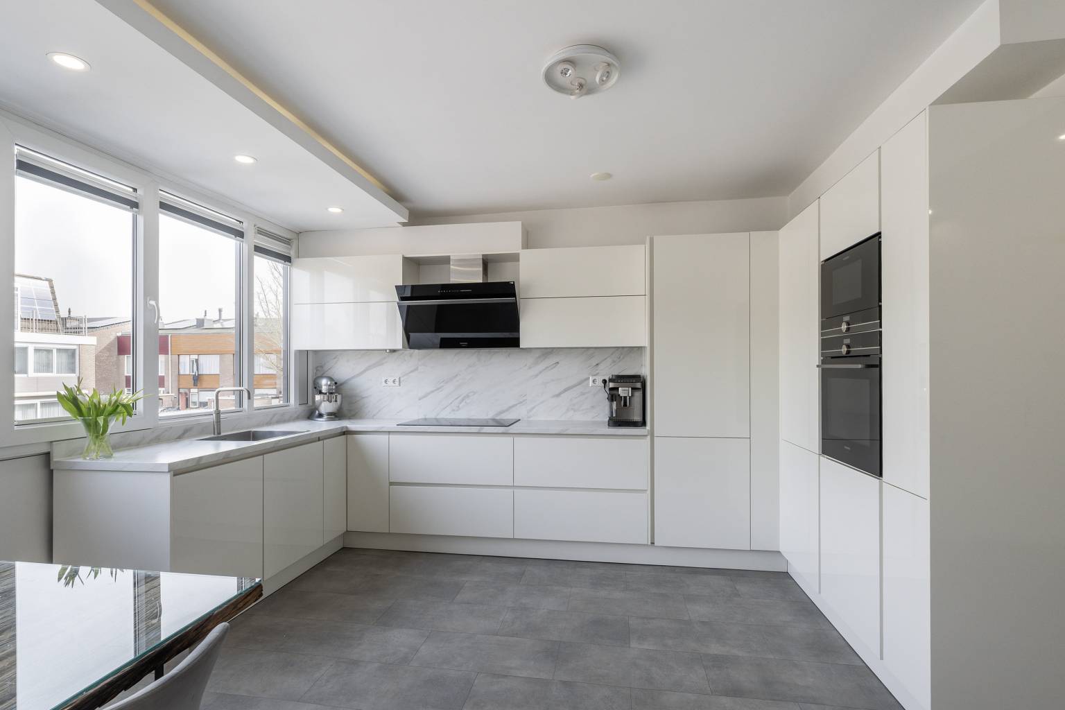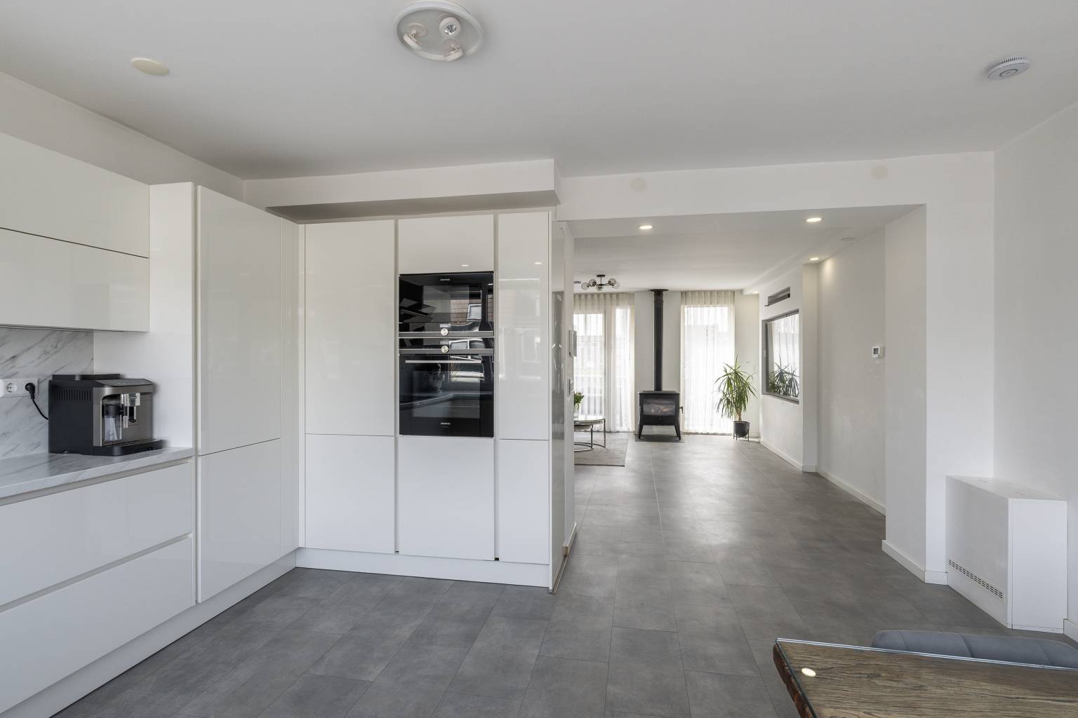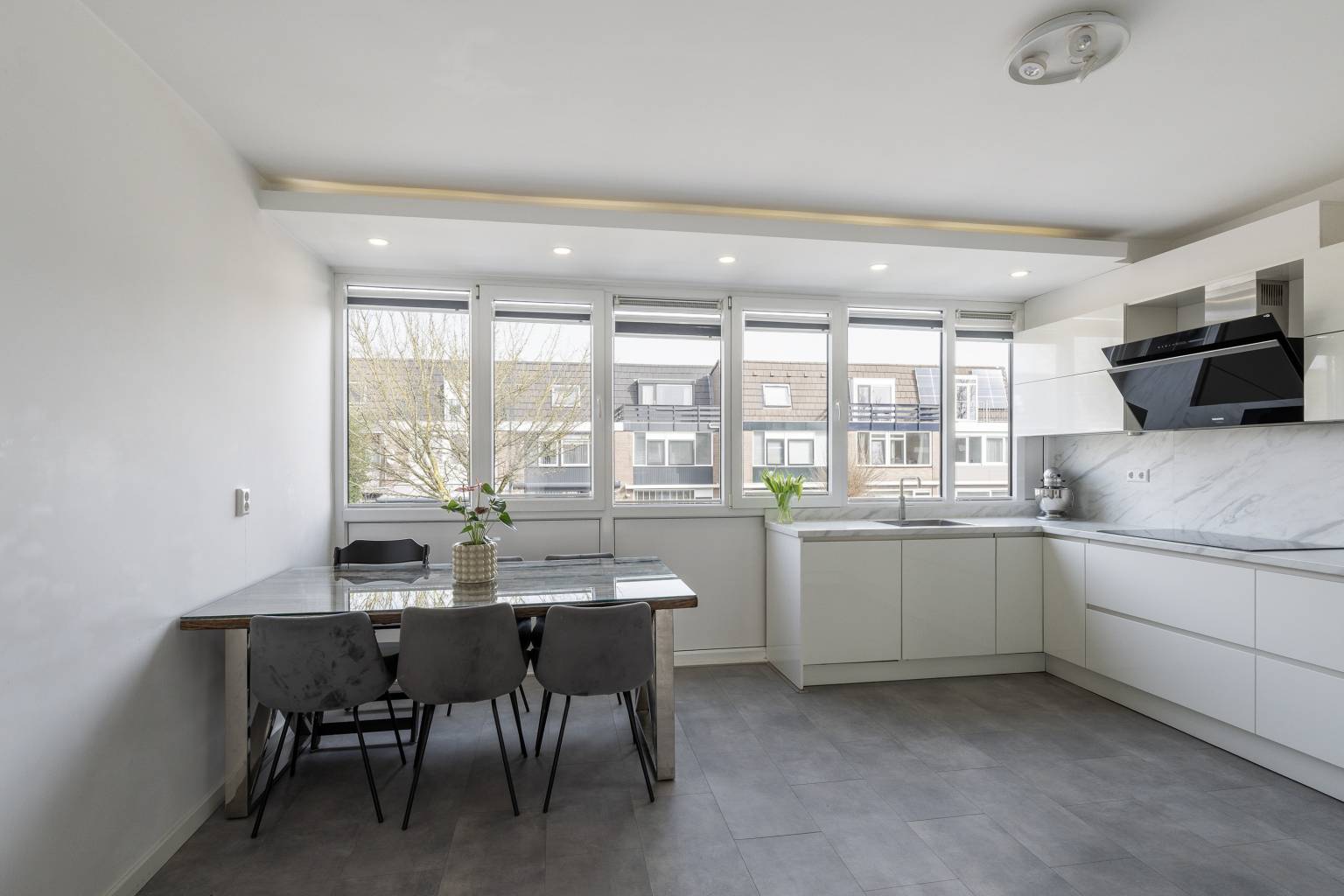 De keuken in de eetkamer is opgesteld in een U-vorm met bovenkasten, waarbij het aanrechtblad doorloopt naar de achterwand. Er is diverse apparatuur van Siemens Studioline aanwezig, zoals een vaatwasser, een koelkast, een magnetron, een oven, een Quooker kraan, een inductiekookplaat en een afzuigkap. Het grote raampartij zorgt voor veel lichtinval en tevens voorzien van een koof met inbouw spots.